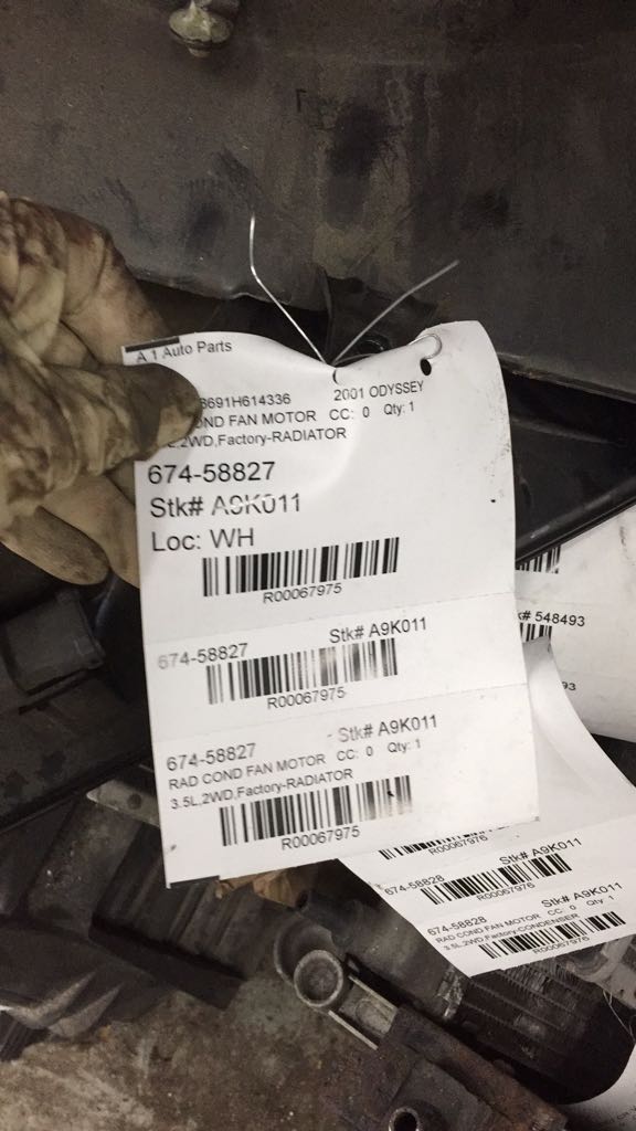 $65.00 Stock#A9K011 Inventory #: R67975 Loc:W1B.1 VIN: 2HKRL18691H614336 Milage: 94730 Source Vehicle Color: GREEN Conditions/Options:3.5L,2WD,Factory-RADIATOR Interchange Part Number:674-58827 Hollander Interchange found this part as interchangeable with: ODYSSEY 99-04 Fan Assembly; radiator