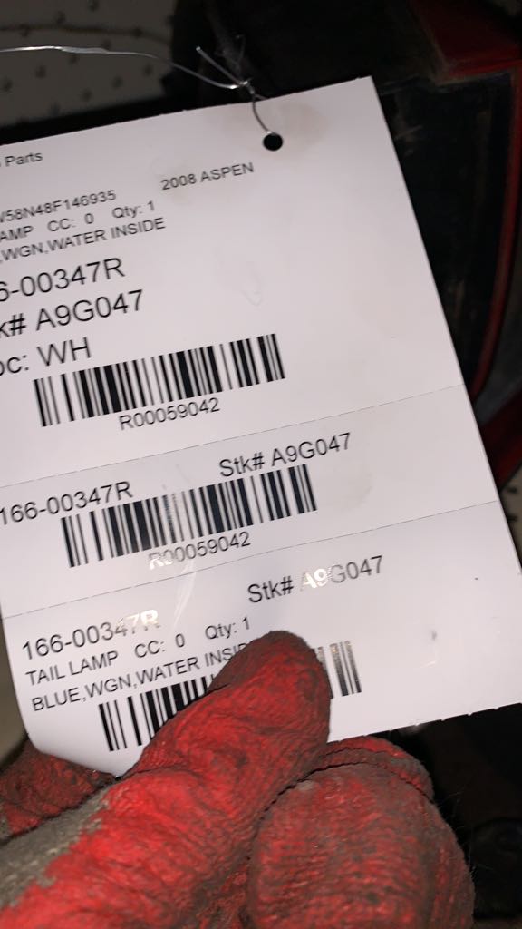 $75.00 Stock#A9G047 Inventory #: R59042 Loc:W1A.AA21E VIN: 1A8HW58N48F146935 Milage: 162237 Source Vehicle Color: BLUE Conditions/Options:BLUE,WGN,WATER INSIDE Interchange Part Number:166-00347R Hollander Interchange found this part as interchangeable with: ASPEN 07-09 R.
